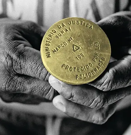 Foto: Marco de bronze do Ministério da Justiça usado na demarcação física das terras indígenas da região do Rio Negro, o mais extenso e contínuo bloco de terras indígenas reconhecido oficialmente em faixa de fronteira na Amazônia brasileira. Crédito: Pedro Martinelli / ISA.